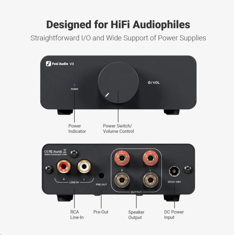 Kompaktní stereo zesilovač osazen prémiovými součástkami, čip Texas Instruments TPA3255, výkon až 2x 300W @ 4?. THD 0,003 %, SNR ? 110 dB. RCA vstup, výstup pre-out, frekvenční rozsah 20 Hz – 20 kHz (±0,1 dB), impedance 2–8 ?. Rozměry: 165 × 104 × 36 mm, napájení DC 48 V. Součástí balení: napájecí adaptér, uživatelský manuál..