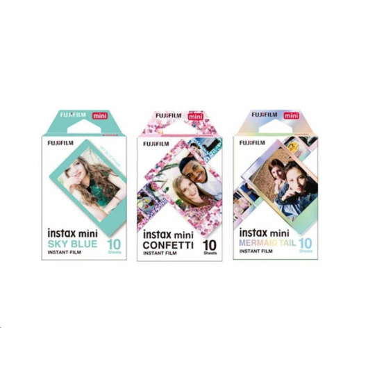 Exkluzivní balení filmů Instax Mini. Každý ze tří balíčků nese jedinečný design rámečku, což vám dává možnost vytvořit fotografie, které nejen zachycují okamžiky, ale také vyprávějí svůj vlastní příběh plný kreativity a osobního výrazu. Užijte si okamžité tisky s Instax Mini a udělejte své vzpomínky ještě výjimečnějšími.  Balení zahrnuje tři odlišné designy okrajů: CONFETTI pro veselé okamžiky, SKY BLUE pokud chcete vyjádřit pozitivní náladu a harmonii a duhový okraj MERMAID TAIL pro nádech kouzla a fantazie..
