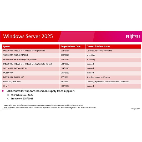 Windows Server 2025 Standard 16 Core ROK. Available only to Fujitsu Broadline Distributors with the ROK Agreement. License card with a COA label; COA label to be affixed on a server system before server shipment. Ships with a server system to the end user.