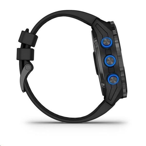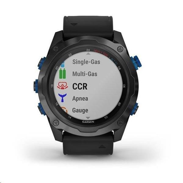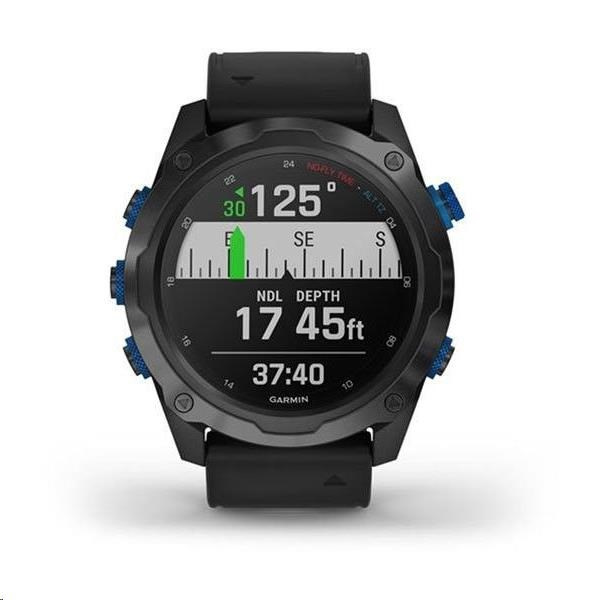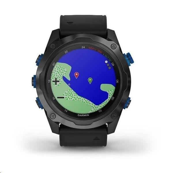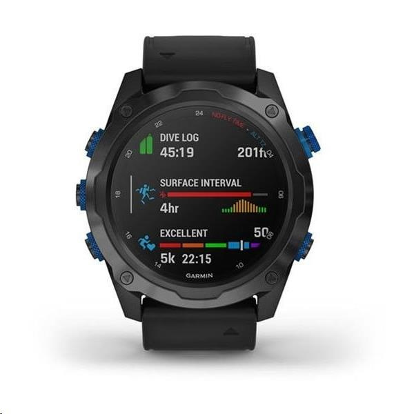 Potápěčský počítač se sonarovou technologií SubWave a s funkcemi chytrých a sportovně všestranných GPS hodinek, s mapami, MP3 hudbou a bezkontaktními platbami Garmin Pay. Safírové sklo, titanová luneta s DLC povrchovou úpravou, silikonový řemínek