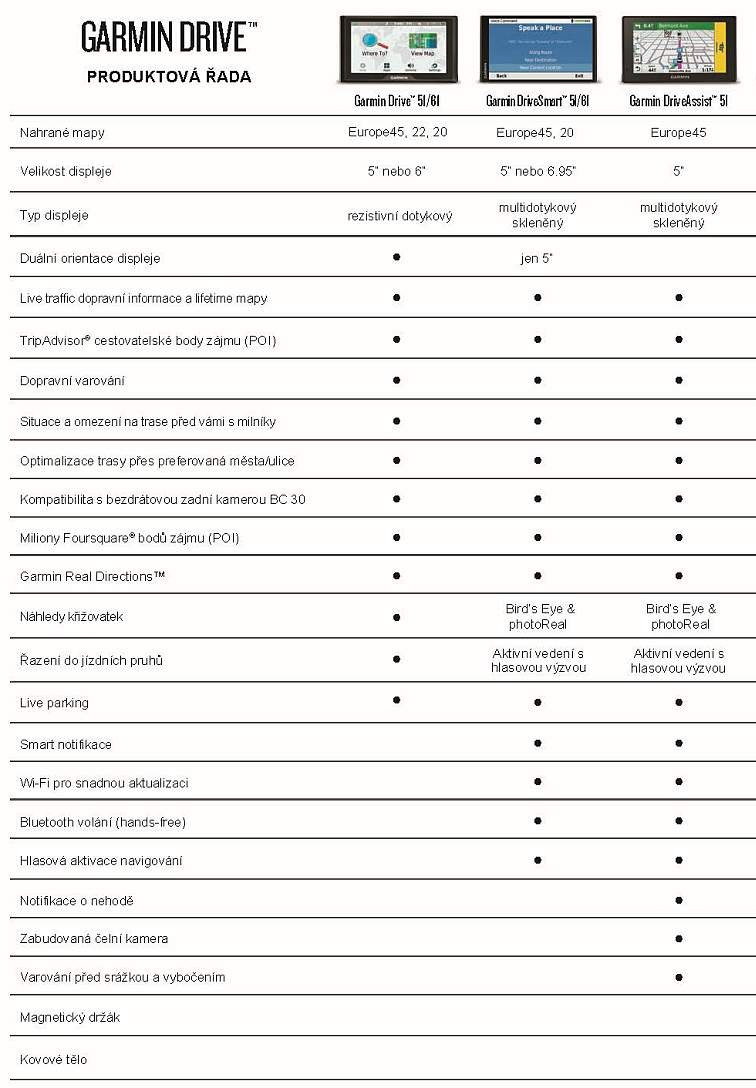 - Upozornění na povolenou rychlost, ostré zatáčky, dopravní kamery atd.