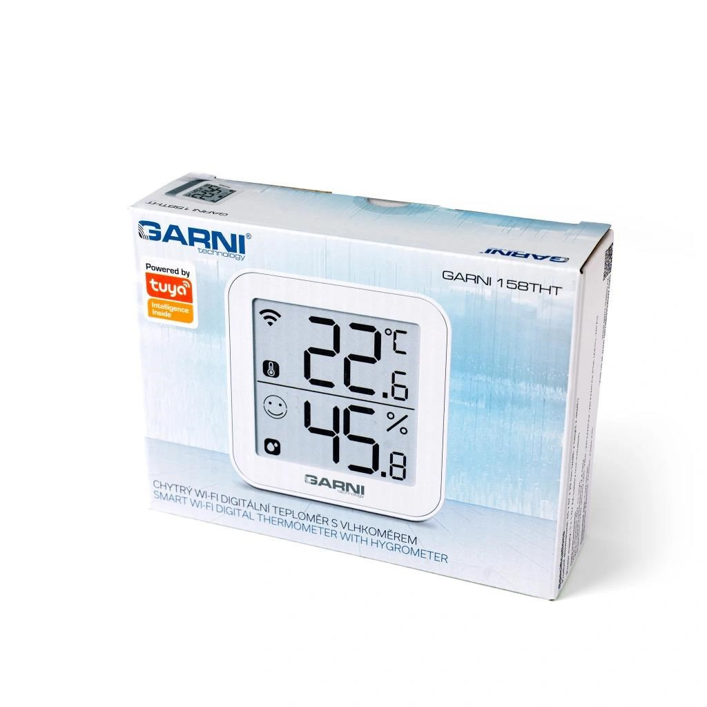 Chytrý vnitřní digitální teploměr s vlhkoměrem model GARNI 158THT má vestavěný modul Wi-Fi a prostřednictvím svého chytrého systému je kompatibilní s platformou Tuya IOT. Pomocí aplikace Tuya Smart můžete sledovat vnitřní teplotu a relativní vlhkost, prohlížet historii záznamů, nastavovat alarmy pro dané veličiny, spouštět pokročilé funkce za pomocí naměřených hodnot a naměřená data odeslat na email v Excel souboru. Je možné jej propojit s dalšími produkty chytré domácnosti, ovládání pak probíhá přes aplikaci v mobilním zařízení. Podporuje integraci do Google Assistant a Alexa.
