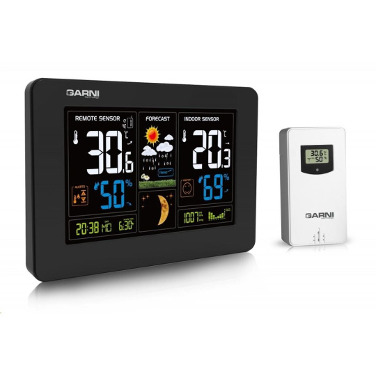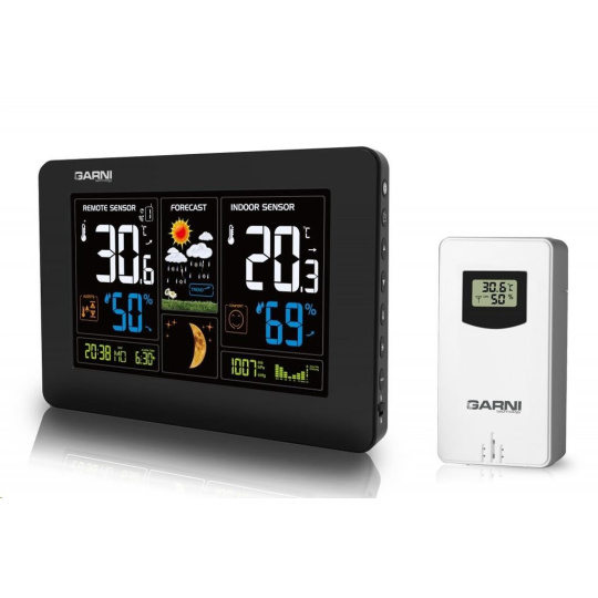 Meteorologická stanice se špičkovým inverzním barevným VA displejem s časem řízeným rádiovým signálem DCF-77, budíkem, měřením vnitřní teploty, relativní vlhkosti a absolutního barometrického tlaku, bezdrátovým čidlem pro měření vnější teploty a relativní vlhkosti a USB portem pro nabíjení externích zařízení inverzní barevný VA displej o rozměrech 167 x 93 mm s možností stálého osvětlení při napájení síťovým adaptérem, nebo krátkodobým osvětlením na 15 s při napájení bateriemi 4 stupně jasu osvětlení displeje, možnost vypnutí osvětlení displeje s možností krátkodobého osvětlení na 15 s (při napájení síťovým adaptérem) velikost číslic na displeji – čas, datum, barometrický tlak 8 mm, zkratka názvu dne 6 mm, vnitřní a vnější teplota 30 mm, vnitřní a vnější relativní vlhkost 20 mm čas a datum řízené signálem DCF-77 s možností manuálního nastavení ikona příjmu signálu DCF-77 zkratka názvu dne 12ti, nebo 24 hodinový formát zobrazení času možnost nastavení časového pásma od -12 do +12 hodin budík s funkcí opakovaného buzení (Snooze) po 5 minutách budící signál - 10 sekund 1 pípnutí za sekundu, 10 sekund 2 pípnutí za sekundu, 10 sekund 4 pípnutí za sekundu a poté stále 8 pípnutí za sekundu 6 animovaných ikon předpovědi počasí (slunečno, polojasno, oblačno, srážky, silný déšť a sněžení) na základě sledování barometrického tlaku vestavěným barometrickým čidlem zobrazení hodnot vnitřní a vnější teploty a relativní vlhkosti paměť na maximální a minimální naměřené hodnoty teploty a rel. vlhkosti s automatickým mazáním v 0:00 hodin měření absolutního barometrického tlaku (mb / hPa nebo inHg) šipky tendence vývoje absolutního barometrického tlaku, vnitřní a vnější teploty a rel. vlhkosti možnost nastavení alarmu horní a dolní meze venkovní teploty v rozsahu od -20°C do +60°C (akustickým signálem a ikonou na displeji) pro každý kanál zvlášť s indikací námrazy v rozsahu od -1°C do +3°C zobrazení teploty ve °C, nebo °F možnost použití až 3 bezdrátových čidel GARNI 30H (jedno čidlo GARNI 030H je součástí dodávky) funkce automatického přepínání kanálů 5 ikon vnitřní tepelné pohody bezdrátový přenos hodnot vnější teploty a relativní vlhkosti na frekvenci 433 MHz ikona příjmu signálu bezdrátového čidla zobrazení fáze Měsíce USB port pro nabíjení mobilních zařízení (pouze při napájení hlavní jednotky síťovým adaptérem), maximální nabíjecí proud 1 000 mA ikony slabých baterií napájení síťovým adaptérem nebo bateriemi možnost postavení, nebo zavěšení barva černá Bezdrátové čidlo GARNI 030H vlhkosti odolné displej o rozměrech 19 x 11 mm velikost číslic na displeji: teplota a relativní vlhkost 4 mm měření teploty a relativní vlhkosti 3 kanály maximální RF výkon 10 dBm (10 mW) možnost postavení a zavěšení barva bílá Obsah balení: 1 x hlavní jednotka GARNI 545 Line 1 x bezdrátové čidlo GARNI 030H 1 x síťový adaptér český, slovenský, německý, anglický, italský, polský a maďarský návod.