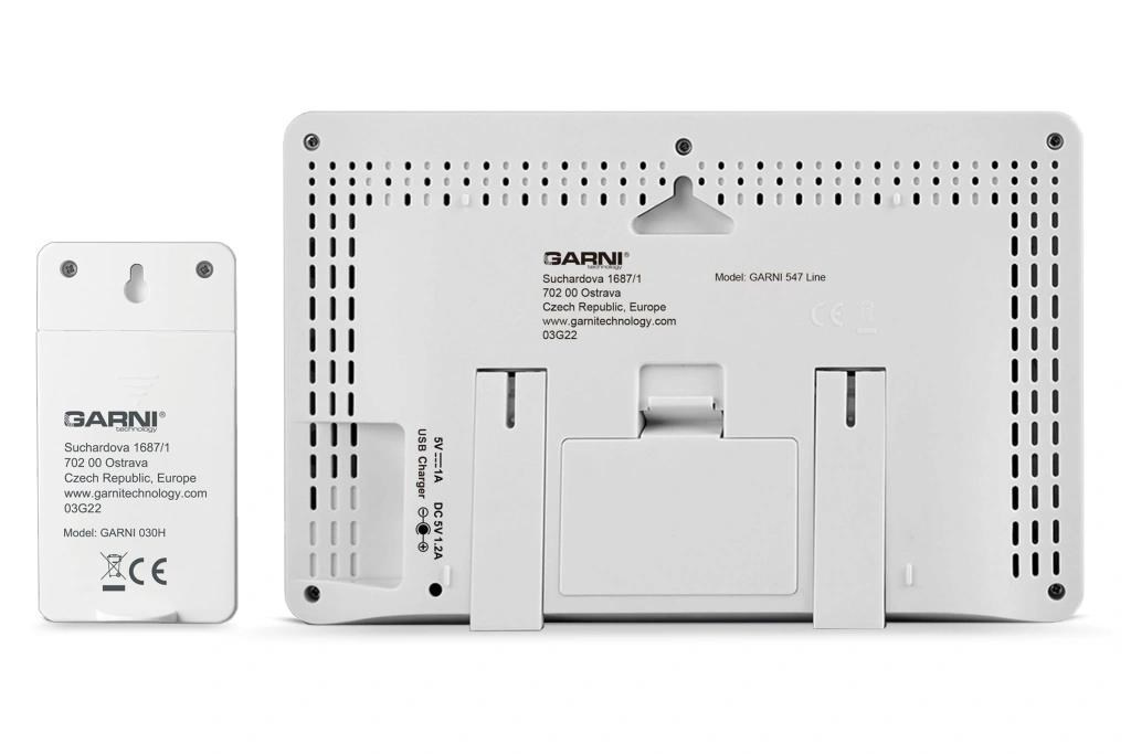 ? inverzní barevný VA displej o rozměrech 167 x 93 mm s možností stálého osvětlení při napájení síťovým adaptérem, nebo krátkodobým osvětlením na 15 s při napájení bateriemi ? ? velikost číslic na displeji – čas, datum, barometrický tlak 8 mm, zkratka názvu dne 6 mm, vnitřní a vnější teplota 30 mm, vnitřní a vnější relativní vlhkost 20 mm ? čas a datum řízené signálem DCF-77 s možností manuálního nastavení ? ikona příjmu signálu DCF-77 ? zkratka názvu dne ? 12ti, nebo 24 hodinový formát zobrazení času ? možnost nastavení časového pásma od -12 do +12 hodin ? ? budící signál - 10 sekund 1 pípnutí za sekundu, 10 sekund 2 pípnutí za sekundu, 10 sekund 4 pípnutí za sekundu a poté stále 8 pípnutí za sekundu ? 6 animovaných ikon předpovědi počasí (slunečno, polojasno, oblačno, srážky, silný déšť a sněžení) na základě sledování barometrického tlaku vestavěným barometrickým čidlem ? ? ? měření absolutního barometrického tlaku (mb / hPa nebo inHg) ? šipky tendence vývoje absolutního barometrického tlaku, vnitřní a vnější teploty a rel. vlhkosti ? ? zobrazení teploty ve C, nebo F ? možnost použití až 3 bezdrátových čidel GARNI 30H (jedno čidlo GARNI 030H je součástí dodávky) ? funkce automatického přepínání kanálů ? 5 ikon vnitřní tepelné pohody ? bezdrátový přenos hodnot vnější teploty a relativní vlhkosti na frekvenci 433 MHz ? ikona příjmu signálu bezdrátového čidla ? zobrazení fáze Měsíce ? USB port pro nabíjení mobilních zařízení (pouze při napájení hlavní jednotky síťovým adaptérem), maximální nabíjecí proud 1 000 mA ? ikony slabých baterií ? napájení síťovým adaptérem nebo bateriemi ? možnost postavení, nebo zavěšení ? barva bílá, přední rámeček z bambusového dřeva Bezdrátové čidlo GARNI 030H ? vlhkosti odolné ? displej o rozměrech 19 x 11 mm ? velikost číslic na displeji: teplota a relativní vlhkost 4 mm ? měření teploty a relativní vlhkosti ? 3 kanály ? maximální RF výkon 10 dBm (10 mW) ? možnost postavení a zavěšení ? barva bílá Obsah balení: 1 x hlavní jednotka GARNI 547 Line 1 x bezdrátové čidlo GARNI 030H 1 x síťový adaptér český, slovenský, německý, anglický, nizozemský, polský a maďarský návod.