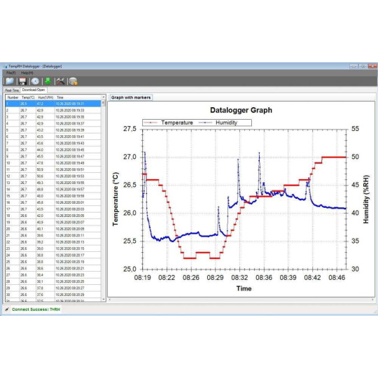 paměť pro 20 010 hodnot teploty a vlhkosti LCD displej o rozměrech 22 x 20 mm pro zobrazení aktuálních, minimálních a maximálních naměřených hodnot možnost nastavení načítání dat od 2 sekund do 24 hodin (2 až 30 s, dále 1, 5, 15, 30 min, dále 1, 5,12, 24 hodin) připojení k počítači přes USB port nastavitelný alarm horní a dolní meze pro teplotu a relativní vlhkost program TempRH Datalogger pro zobrazení naměřených hodnot pro OS Windows až do verze Windows 10 (32 bit a 64 bit) zobrazení naměřených dat v reálném čase v přiloženém programu včetně grafu možnost odloženého zahájení měření data ve formě zprávy v pdf fornátu a tabulky ve formátu *.csv a ve formátu *.imtr (Meter Files - lze otevřít přiloženým programem) součástí balení je datalogger, poutko, baterie, CD s programem a návod.