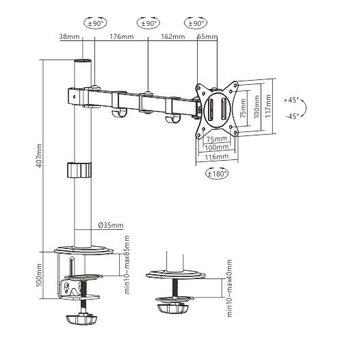 - Rameno umožňuje otáčet, vysouvat, zatahovat nebo naklánět váš displej a umožňuje otočení displeje z režimu na šířku do režimu na výšku atd.