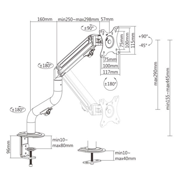 - Odolné nastavitelné plynové pružiny vhodné pro monitory 2 - 8 kg