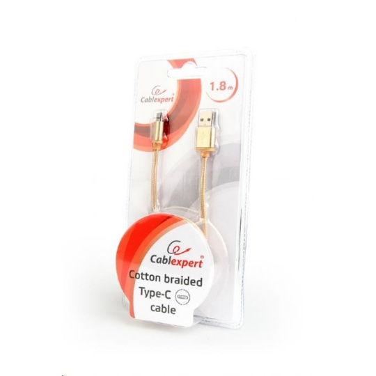 Cotton braided Type-C USB cable with metal connectors, 1.8 m, gold color, blister