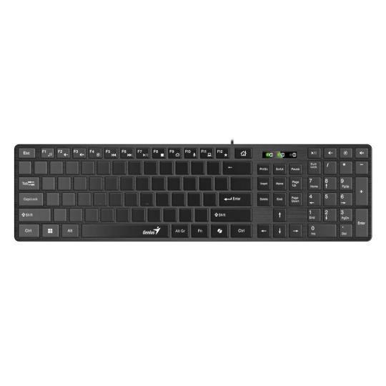 Elegantní drátová klávesnice v černém provedení disponuje tenkým profilem a komfortním jemným sklonem. Díky tomu poskytuje uživateli maximální pohodlí při každodenní práci. Předností jsou také multimediální klávesy pro ztlumení zvuku, otevření e-mailu apod. Klávesnice má speciální layout bez popisků na klávesách a je tak vhodná pro výuku desetiprstové hmatové metody psaní. Je vybavena samostatnou klávesou pro vyvolání AI asistenta Microsoft Copilot v systému Windows. Připojení k počítači je realizováno skrze USB port.