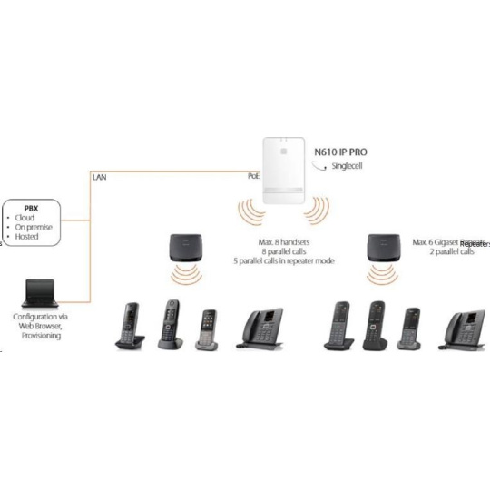 The Gigaset N610 IP PRO is the choice for cordless telephony convenience for up to 8 users. Up to 8 parallel calls guarantee a high degree of readiness in your business environment. Calls are secure due to SRTP and TLS. Contacts are always at hand on N610's central phonebook, or can be connected via LDAP, XML. With possibility to create own xhtml applications, users can access and control data relevant for business tasks. N610 is compatible to a large number of on-premise and cloud PBXs and easy to setup by autoprovisioning. It can be extended by up to 6 Gigaset repeaters to reach a larger DECT coverage area.