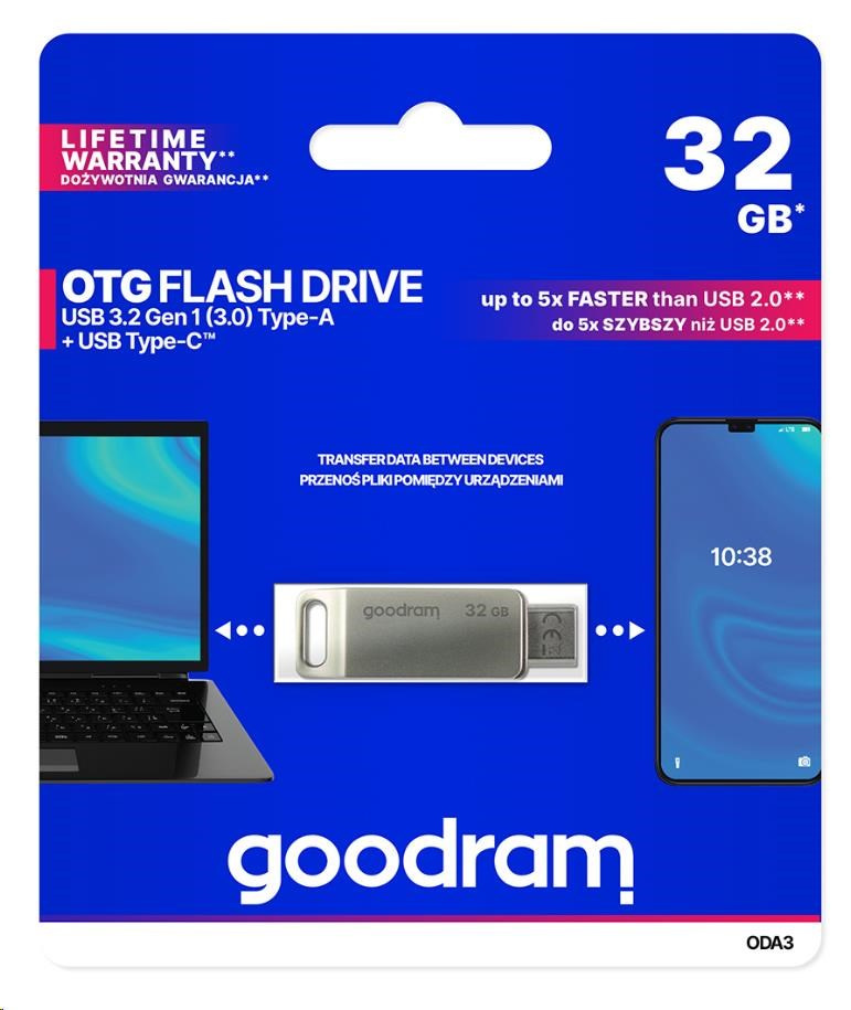 Type-C™ is becoming the most popular USB type used to transfer data between all electronic devices. The growing popularity of this solution is supported by the fact that manufacturers of next gen laptops, smartphones, PCs and other devices are increasingly equipping their products with an additional “C” next to the standard type A connector or choose only Type-C™. GOODRAM OTG ODA is an excellent solution that will work both with an old and new electronic devices generation laptops, smartphones and PCs. The ODA Flash drive is equipped with two fast USB 3.2 connectors: one standard type A and the Type-C™, which means that data transfer between devices of different generations has never been so easy and fast.