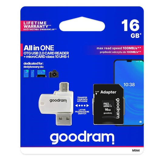 GOODRAM M1A4 All in One delivers versatility by providing functionality of few devices in one solution. It is a card reader equipped with USB 2.0 and micro USB connectors, allowing easy data transfer between computers, smartphones, tablets and cameras. It comes bundled with a fast UHS-I microCard.