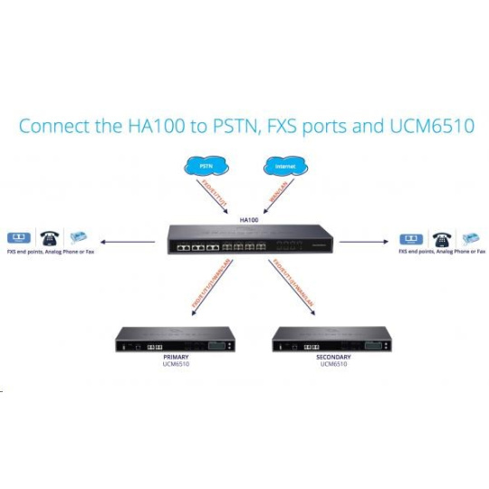 Grandstream HA100 představuje automatické bezvýpadkové (failover) řešení pro ústředny Grandstream UCM6510. Při připojení dvou UCM6510 začne HA100 konstantně monitorovat stav obou UCM6510 a v případě výpadku automaticky přepne celý systém z nefunkční na funkční ústřednu. Toto přepnutí přesune včetně připojených telefonních linkách, síťových linkách, pomocných zařízení a všech SIP účtů uložených v předchozí primární UCM6510. Přesun nastavení a spuštění druhé ústředny do provozního režimu trvá mezi 10 a 50-ti sekundami, přičemž čas závisí na množství registrovaných SIP účtů. Díky tomuto zařízení získají nároční zákazníci chytré monitorovací a bezvýpadkové řešení, které zajistí bezproblémový provoz. Vlastnosti: Spojí a konstantně monitoruje dvě UCM6510 pro neustálou dostupnost Automaticky přepojí na stand-by druhou ústřednu UCM6510 v případě výpadku primární Až 14 LED indikátorů ukazující stav v reálném čase Rychlé zotavení při výpadku, přepnutí mezi ústřednami během 10 až 50-ti sekund.
