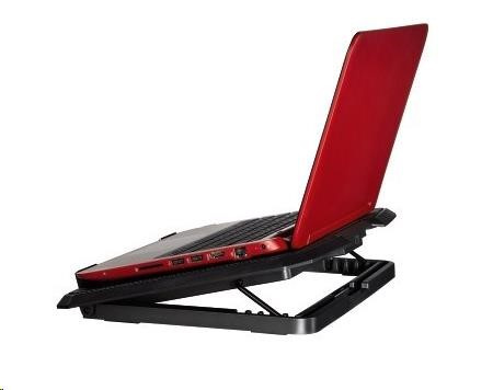 - chladicí stojan pro notebook - pohodlné pracovní podmínky díky šikmé poloze notebooku - ventilátor s modrým LED podsvícením - stabilní umístění díky pogumované spodní části - nízká spotřeba (šetří akumulátor notebooku) - napájení přes USB - velmi nízká provozní hlučnost Technické parametry: - pro notebooky s úhlopříčkou 34 až 40 cm (13,3“ až 15,6“) - hlasitost: 23 dBA - počet ventilátorů: 2 - odběr proudu (USB): 320 mA - rozměry: 27 x 3 x 37 cm - hmotnost: 802 g - barva: černá.