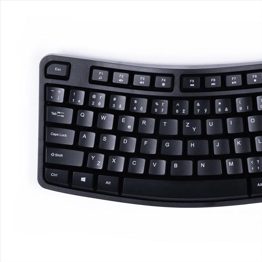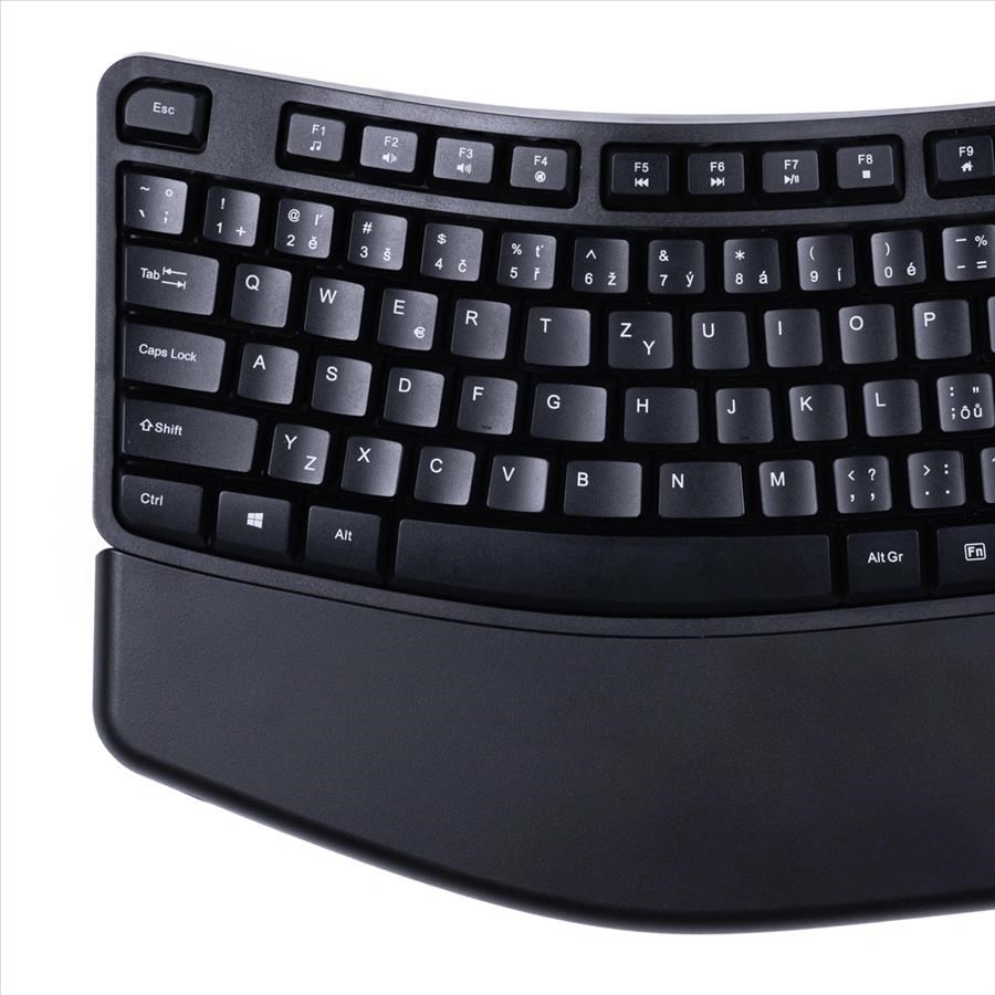 - ergonomicky tvarovaná klávesnice pro větší komfort a správné držení těla při práci, předchází bolestem a přetížení ramen a šíje