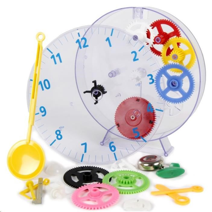 • dětská stavebnice analogových mechanických hodin • poháněno pružinou • materiál plast • nevhodné pro děti do 3 let • průměr ciferníku 196 mm • průhledný kryt, barevné díly.