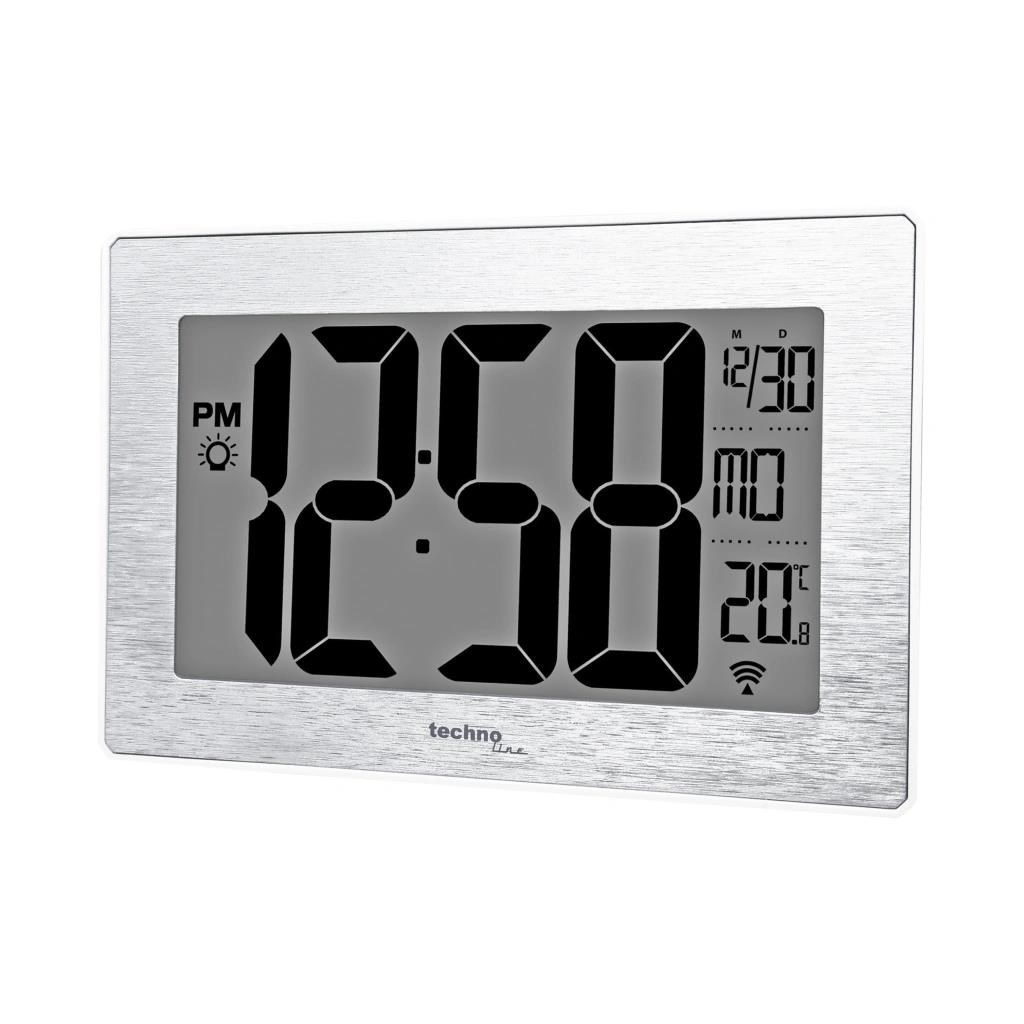 Digitální nástěnné hodiny s LCD displejem, nočním podsvícením, časem řízeným rádiovým signálem DCF-77 a měřením vnitřní teploty • nástěnné hodiny s možností postavení • velikost inverzního displeje 168 x 95 mm • možnost nastavení intervalu nočního podsvícení displeje oranžovým světlem, dva stupně jasu • velikost číslic - čas 87 mm, datum 15 mm (měsíc), 9 mm (den), teplota 19 mm • čas řízený rádiovým signálem DCF-77 • formát zobrazení času 12, nebo 24 hodin • datum s názvem dne (jazyk EN, DE, FR, IT a ES) • datum • časová zóna od -9 do +9 hodin • měření vnitřní teploty • ikona slabých baterií • napájení na baterie • barva bílá se stříbrným rámečkem.
