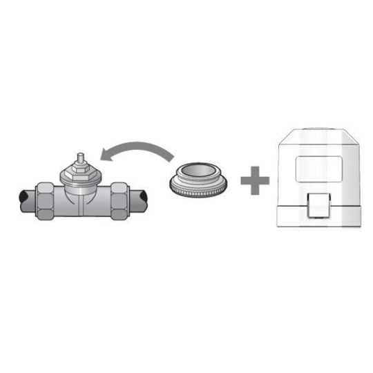 Univerzální adaptér pro připojení servopohonu ventilu (např. HmIP-VDMOT) a termostatických hlavic předních výrobců nacvaknutím, šroubení na standard M30 x 1,5 mm.
