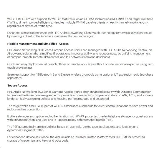| Flexible Operation and Management Our unified APs can operate as standalone access points or with a gateway for greater scalability, security, and manageability. APs can be deployed using zero touch provisioning - without on-site technical expertise - for ease of implementation in branch offices and for remote work. Aruba APs can be managed using cloud-based or on-premises solutions for any campus, branch, or remote work environment. As the management and orchestration console for Aruba ESP (Edge Services Platform), Aruba Central provides a single pane of glass for overseeing every aspect of wired and wireless LANs, WANs, and VPNs. AI-powered analytics, end-to-end orchestration and automation, and advanced security features are built natively into the solution. The 503 Series APs can also be deployed using HPE Greenlake for Aruba for flexible consumption and financing options.