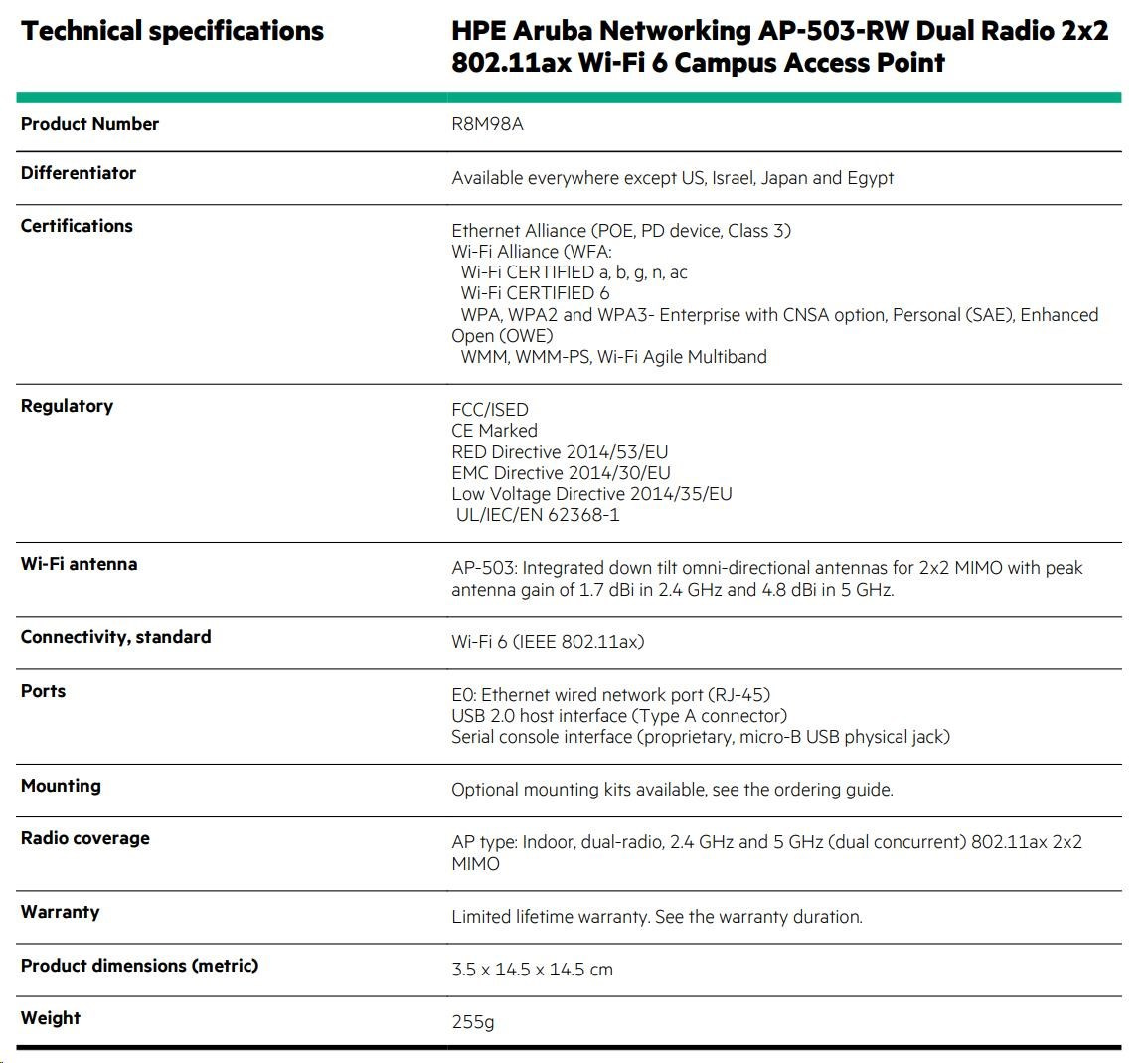 HPE Aruba Networking AP-503-RW Dual Radio 2x2:2 802.11ax Wi-Fi 6 Campus Access Point (Includes Mount Bracket) R8M98A