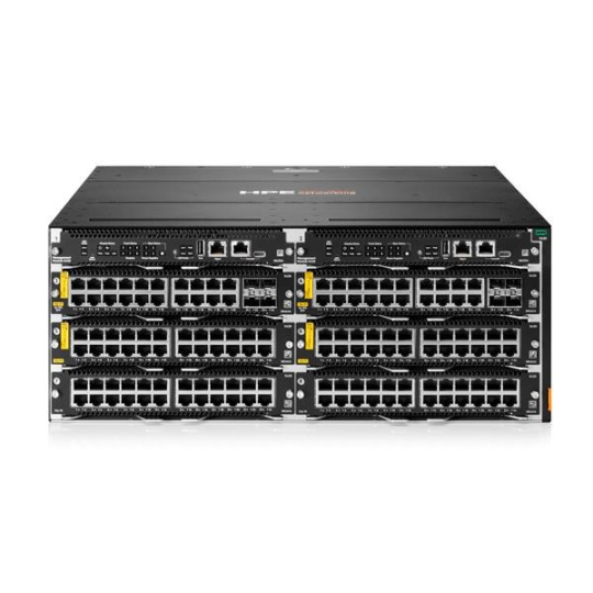 A powerful HPE Aruba Networking Gen7 ASIC architecture delivers performance and feature support with flexible programmability for tomorrow's applications. The HPE Aruba Networking Virtual Switching Extension (VSX) with live upgrades provides high availability, fast, non-disruptive upgrades, and simplified management. This advanced modular 4U chassis switch offers performance up to 960 Gbps with low latency, six half-width line card slots with line rate up to 64 bytes, and up to 90 W Smart Rate 10 GbE PoE. The Layer 3 chassis provide BGP/OSFP/RIP/PIM support with single data-plane VRF and management VRF.