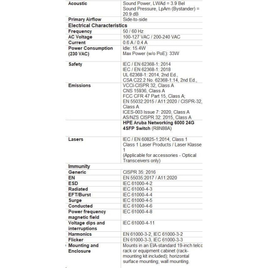 | Emissions | VCCI-CISPR 32, Class A CNS 15936, Class A FCC CFR 47 Part 15, Class A; EN 55032:2015 / A11:2020 / CISPR-32, Class A ICES-003 Issue 7: 2020, Class A AS/NZS CISPR 32: 2015, Class A |