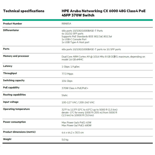 HPE Aruba Networking CX 6000 48G Class4 PoE 4SFP 370W Switch.