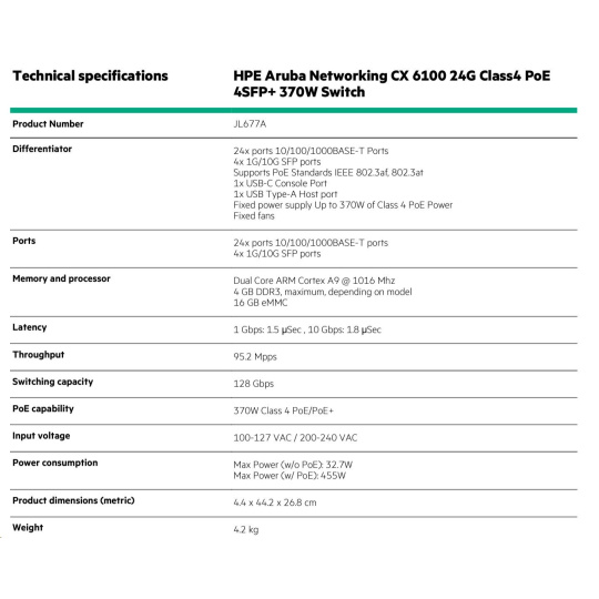 |   Specifications  |    Aruba 6100 24G Class4 PoE 4SFP+ 370W Switch (JL677A)  |