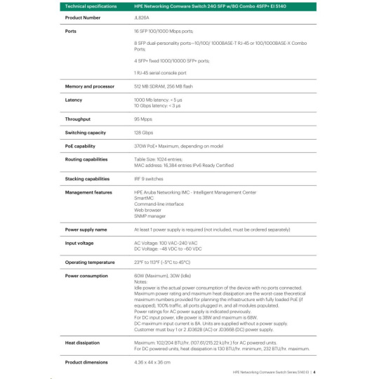| Management | IMC - Intelligent Management Center; SmartMC;command-line interface; Web browser; SNMP Manager | |