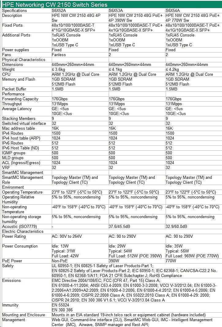 HPE Networking CW 2150 48p 10M/100M/1G 4p SFP+ 1G/10G Switch.
