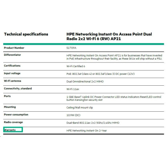 Name HPE Networking Instant On Access Point Dual Radio 2x2 Wi-Fi 6 (RW) AP21