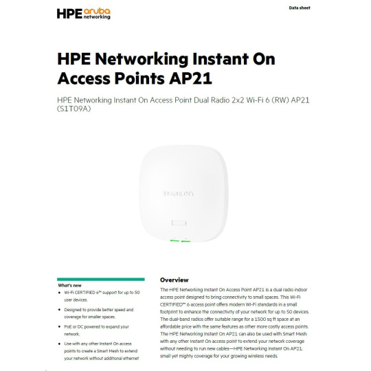 - The HPE Networking Instant On Access Point AP21 is a dual radio indoor access point designed to bring connectivity to small spaces. This Wi-Fi CERTIFIED™ 6 access point offers modern WI-Fi standards in a small footprint to enhance the connectivity of your network for up to 50 devices. The dual-band radios offer suitable range for a 1500 sq ft space at an affordable price with the same features as other more costly access points. The HPE Networking Instant On AP21 can also be used with Smart Mesh with any other Instant On access point to extend your network coverage without needing to run new cables—HPE Networking Instant On AP21, small yet mighty coverage for your growing wireless needs.