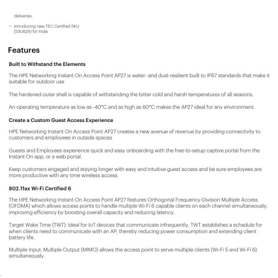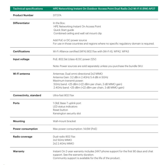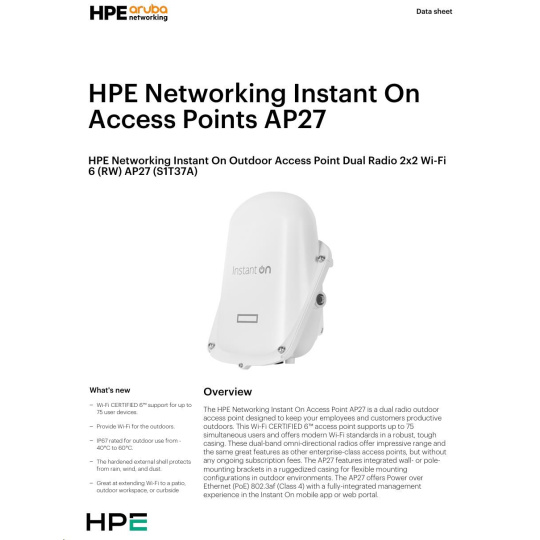 The HPE Networking Instant On Access Point AP27 is a dual radio outdoor access point designed to keep your employees and customers productive outdoors. This Wi-Fi CERTIFIED 6™ access point supports up to 75 simultaneous users and offers modern Wi-Fi standards in a robust, tough casing. These dual-band omni-directional radios offer impressive range and the same great features as other enterprise-class access points, but without any ongoing subscription fees. The AP27 features integrated wall- or pole-mounting brackets in a ruggedized casing for flexible mounting configurations in outdoor environments. The AP27 offers Power over Ethernet (PoE) 802.3af (Class 4) with a fully-integrated management experience in the Instant On mobile app or web portal.
