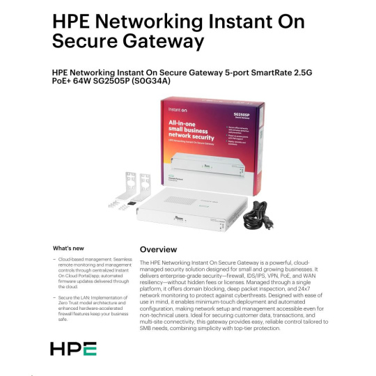 The HPE Networking Instant On Secure Gateways are cloud-managed gateways designed for small and growing businesses looking to enhance the security of their network or safely expand to new locations. These gateways, purpose-built for SMBs, provide 24x7 network monitoring, an IDS/IPS engine, and domain blocking for enhanced protection. Thanks to hardware acceleration, with all these features active, the gateway can still provide near-line rate throughput.