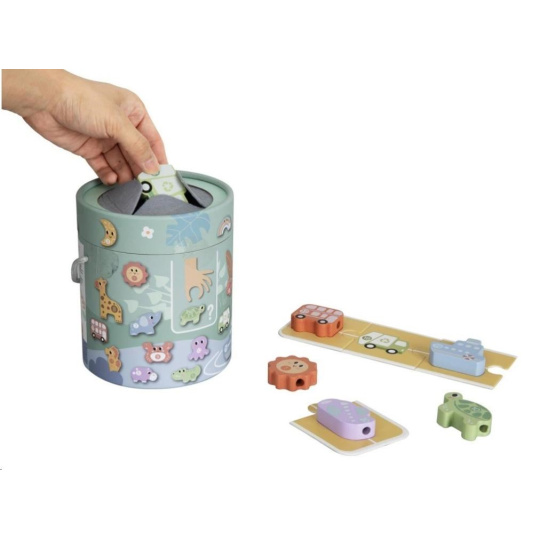 Oblíbená společenská hra Hmatej a najdi 2v1 nabízí spoustu zábavy a možností ke hře. Hra s očíslovanými dřevěnými zvířátky a tvary, kyblíkem a navlékacími provázky dokonale potrénuje motorické dovednosti, seznámí děti se zvířátky a číslicemi. Hra Hmatej a najdi spočívá v hledání správného dřevěného tvaru v kyblíku, kdy pouze hmatem musíte najít požadovaný tvar. Hru můžete hrát různým způsobem a přizpůsobit ji věku i dovednostem každého hráče. Užijte si společné chvíle při hře se zvířátky ze ZOO.