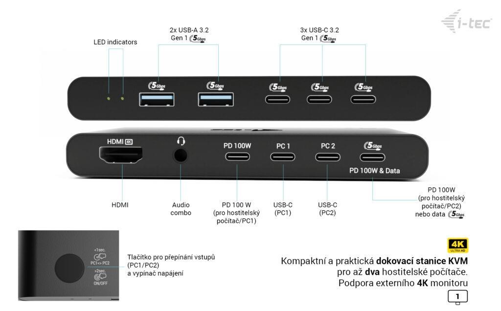 i-tec KVM Docking Station HDMI for 2 hosts, Power Delivery 2x 100W