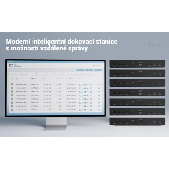 * Vzhledem k tomu, jak funguje technologie Thunderbolt™, i-tec DockMate dokáže spravovat samotnou dokovací stanici (například vzdálené zapnutí/vypnutí, plánované úspory energie nebo aktualizace firmwaru), ale nemůže přímo řídit jednotlivé porty, jako jsou USB, LAN, audio nebo obrazové výstupy.