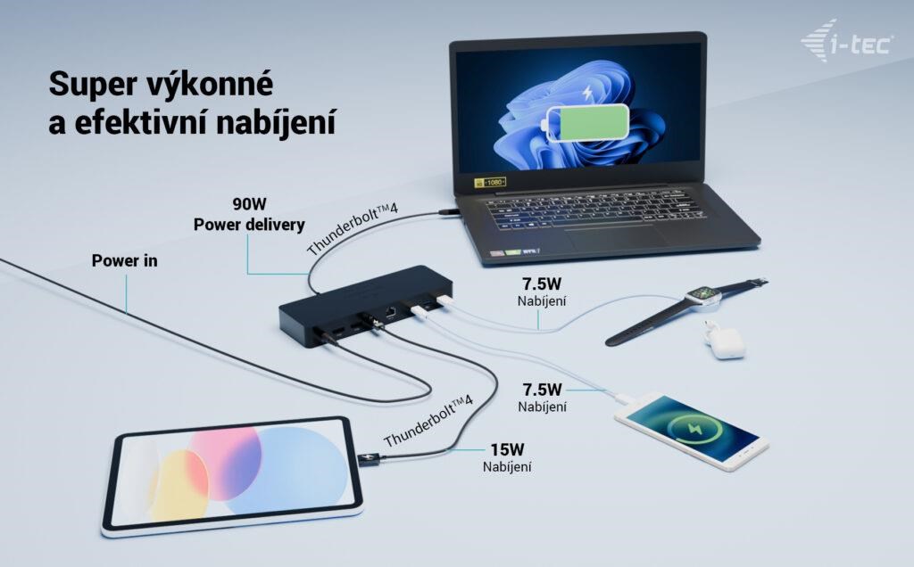- Poskytuje napájení až 90 W připojenému notebooku nebo tabletu.
