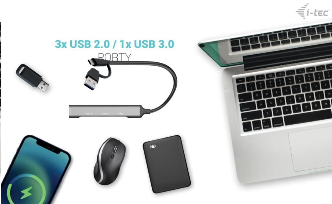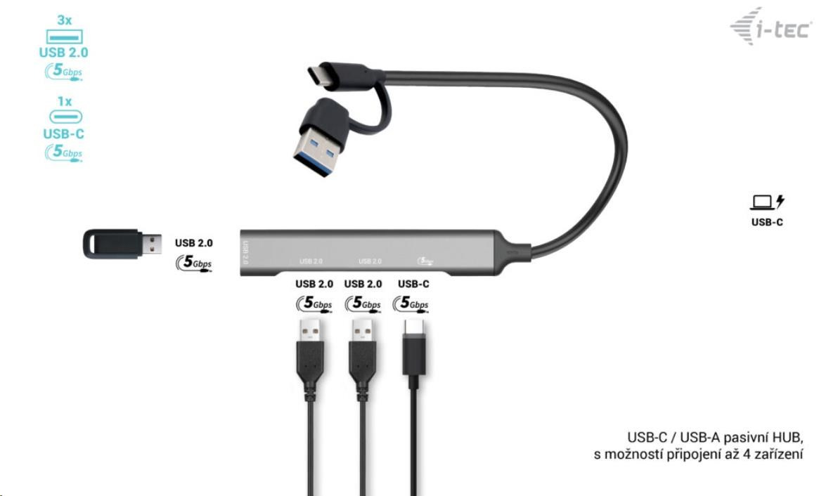 - Univerzální pasivní HUB USB-C/USB-A umožňuje připojit až 4 zařízení.