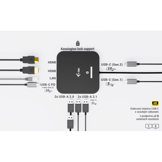 Moderní USB-C dokovací stanice pro kancelářské použití s podporou až dvou externích monitorů v rozlišení 4K. Stanice je kompatibilní s jakýmkoli notebookem vybaveným portem USB-C, USB4 nebo Thunderbolt 3/4/5. Nabízí 6 USB portů, spolehlivé a rychlé připojení k firemní síti díky integrovanému LAN portu a možnost instalace za monitor, což z ní dělá ideálního partnera pro profesionální použití. Samozřejmostí je také schopnost nabíjení notebooku nebo tabletu výkonem až 100 W.