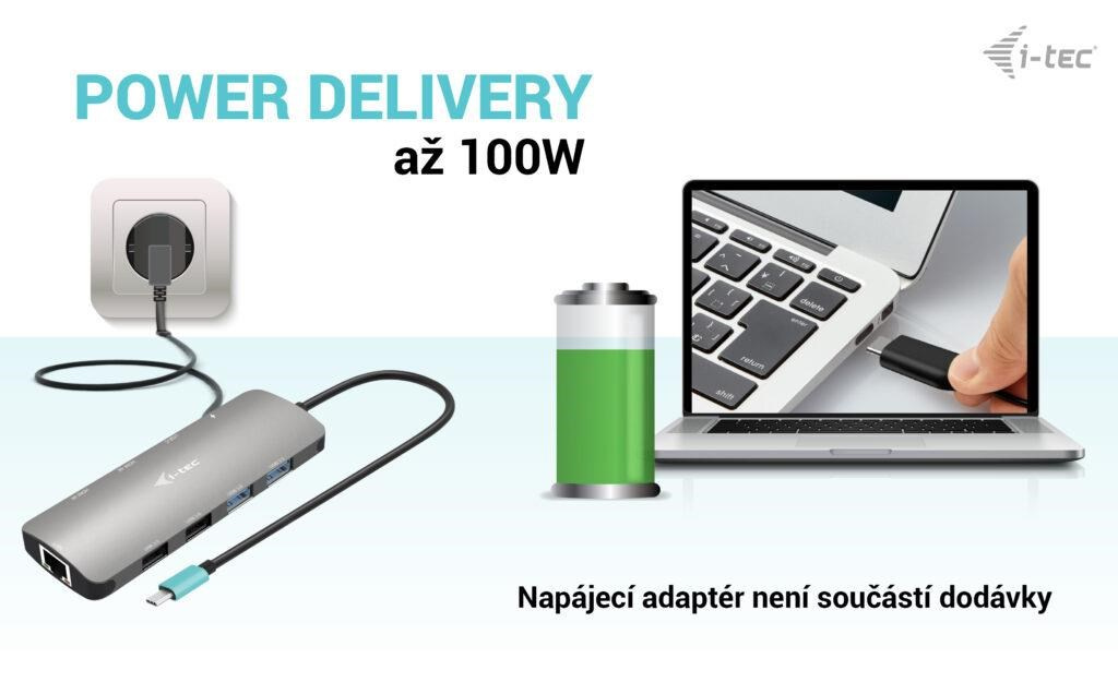 - Dokovací stanice podporuje až 100W napájení připojeného notebooku nebo tabletu (nabíječka USB-C není součástí dodávky)