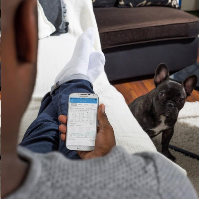Při použití vašeho smartphonu (nebo tabletu) při vážení získáte okamžitě přehled o všech aktuálních údajích. Stačí zapnout Bluetooth a spustit aplikaci MyVitals. Jakmile vstoupíte na váhu, dojde k automatickému přenosu a vyhodnocení dat. Aktuální hmotnost hned vidíte také na obrazovce.