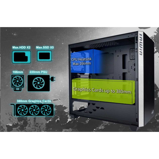 | Maximum Compatibility | VGA Card Length: 380mm (Maximum) VGA Card Width: 170mm (Maximum) Vertical Display VGA Card Thickness: 58mm (Maximum) CPU Heatsink Height: 166mm (Maximum) |
