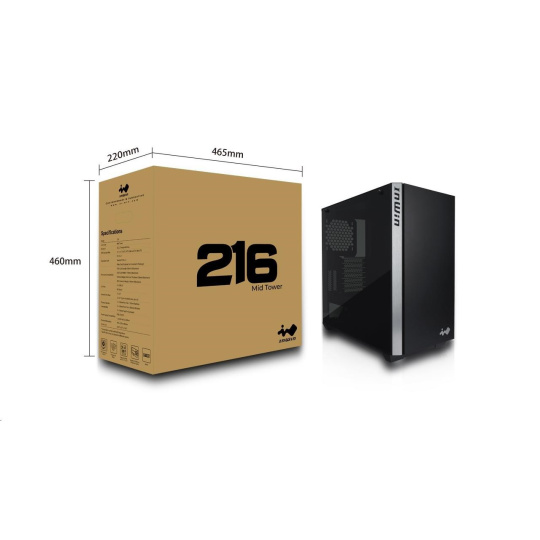 IN WIN skříň 216, mid tower, 220mm PSU, 166mm fan,, 2xHDD, 5xSSD, 2x USB 3.0 / HD Audio / Black