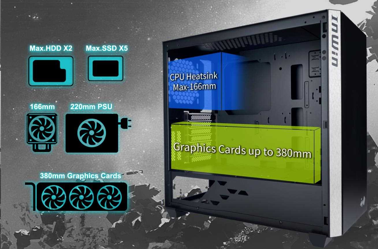 | Maximum Compatibility | VGA Card Length: 380mm (Maximum) VGA Card Width: 170mm (Maximum) Vertical Display VGA Card Thickness: 58mm (Maximum) CPU Heatsink Height: 166mm (Maximum) |