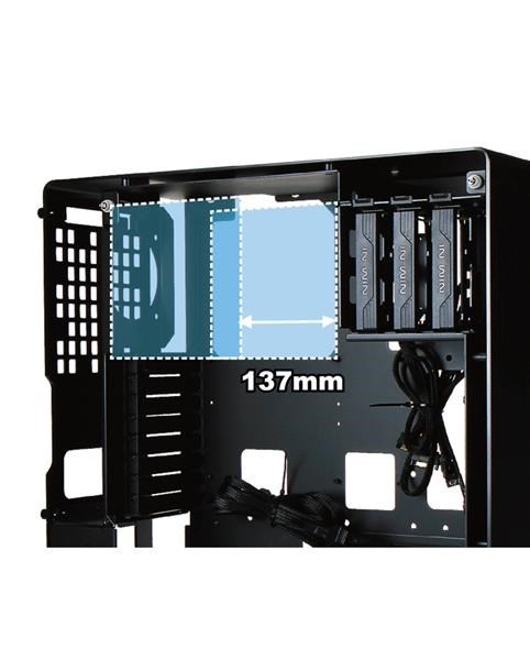 Kromě elegantního a nádherného vzhledu skříň 904 disponuje také excelentním odvodem tepla, díky designu, který napomáhá k optimálnímu chlazení. Do skříně lze také zakomponovat 90mm zadní větrák, 140mm spodní větrák, externí 120/140mm vodní chlazení, nebo CPU chladič až do velikosti 137 mm.
