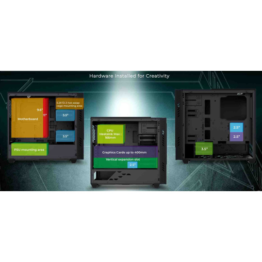 | Maximum Compatibility | VGA Card Length: 400mm (Maximum) (Length up to 7 x 400mm slots when removing 4 x 3.5’’ HDD Cages ) VGA Card Width: 170mm (Maximum) CPU Heatsink Height: 166mm (Maximum) |