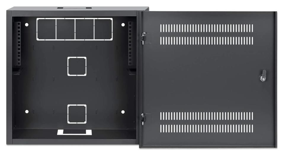 Low-Profile 19" Wall Mount Cabinet with 4U Horizontal and 2U Vertical Rails Slim, Space-saving Enclosure with Only 170 mm (6.7 in.) Depth, Ideal for AV, Multimedia and Surveillance Applications, Assembled, Black RAL 7021 SKU: 713689 Highlights Slim, space-saving design for organized, secure housing of network, multimedia, surveillance, audio/video and smart home equipment Horizontal 4U 19" rackmount option for PDUs, patch panels and other equipment with a depth up to 170 mm (6.7 in.) Vertical 2U 19" rackmount option for network switches and other equipment with a depth up to 280 mm (11 in.).