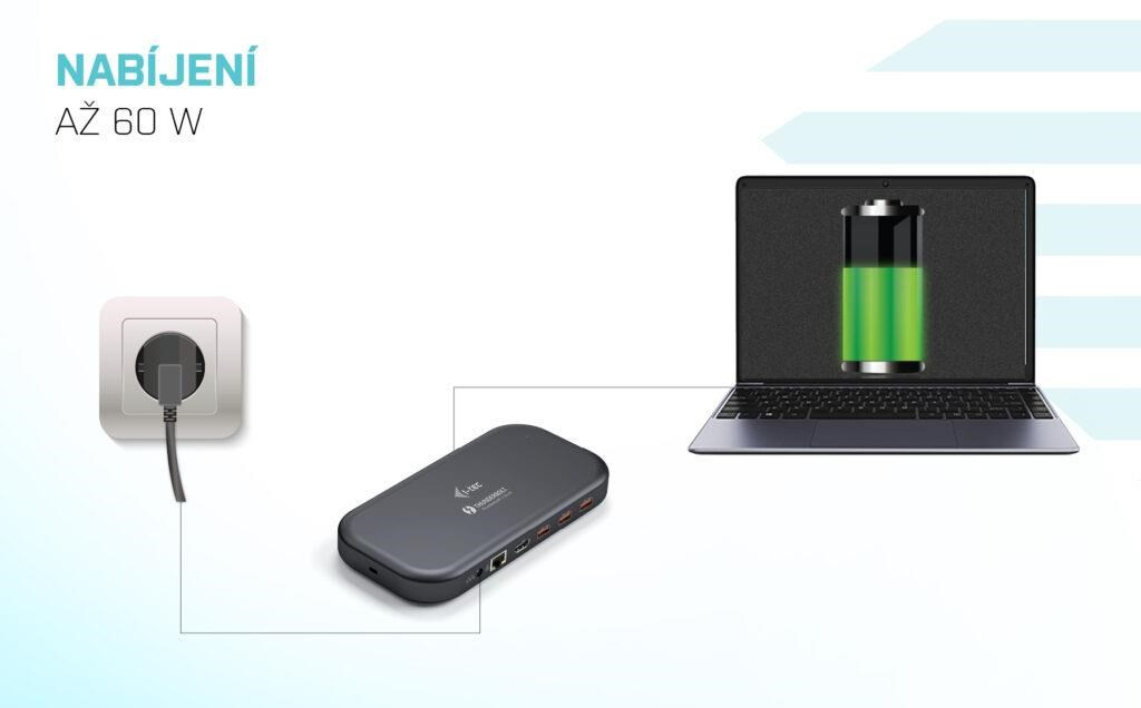 - Poskytuje až 60W Power Delivery pro kompatibilní notebooky a tablety s rozhraním USB4, USB-C a Thunderbolt. Hostitelské zařízení musí podporovat USB-C Power Delivery.
