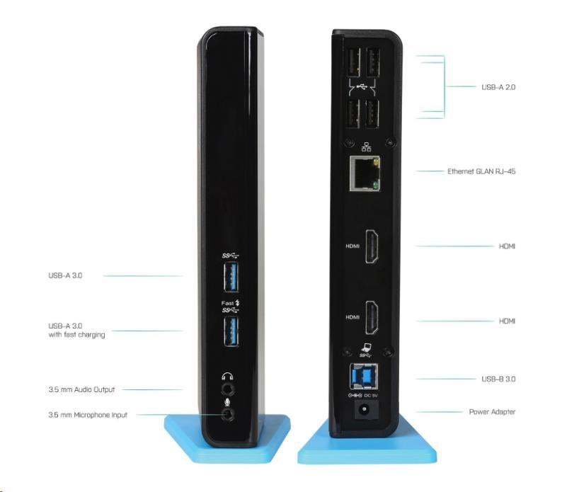 Stanice podporuje až 2x externí monitor, který připojíte díky HDMI portům. 6x USB port, spolehlivé a rychlé připojení k internetu díky integrovanému LAN portu a nechybí ani podpora audio vstupu a výstupu.